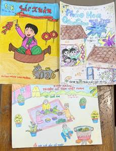 Các em đã khéo léo lồng ghép những hình ảnh đặc trưng như hoa mai, hoa đào, bánh chưng và cờ Tổ quốc vào các mẫu thiết kế bìa sách sinh động.